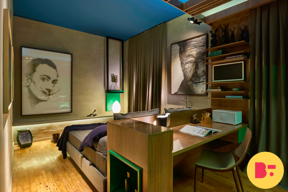 DICA BÔNUS: VALE PINTAR O TETO? CLARO! E ESTA É UMA MANEIRA MUITO OUSADA DE TRAZER COLORIDO PARA O AMBIENTE. SÓ TOME CUIDADO. UMA COR MUITO ESCURA NUM AMBIENTE COM PÉ DIREITO BAIXO PODE CAUSAR A SENSAÇÃO DE O ESPAÇO SER AINDA MENOR, MAS SE ESTA FOR A SUA INTENÇÃO ENTÃO ESTARÁ TUDO CERTO!!